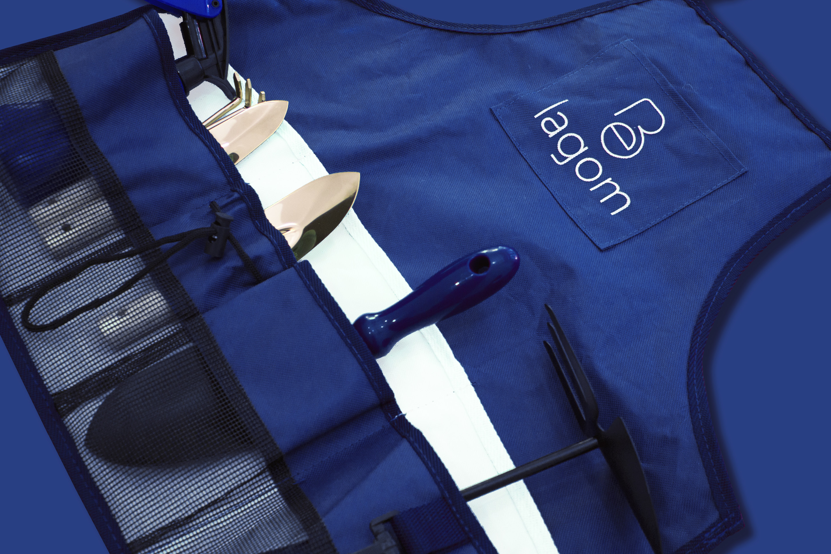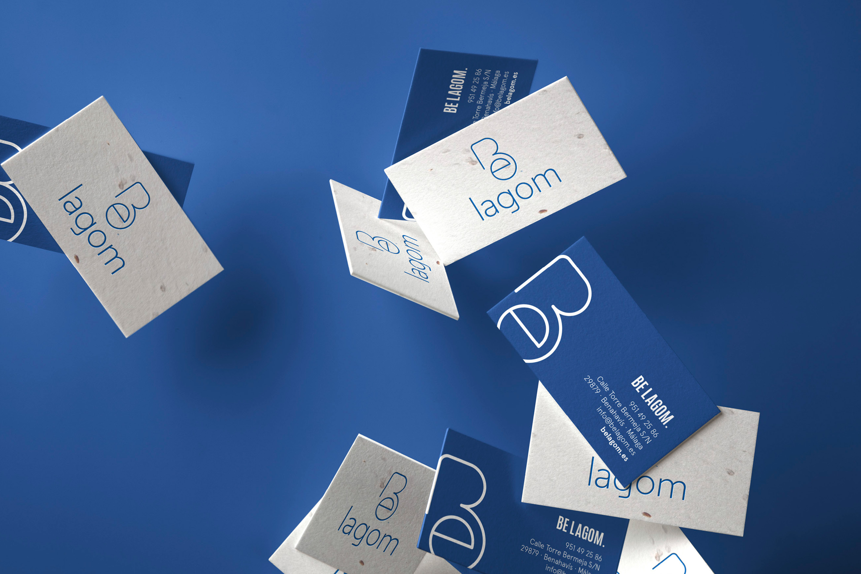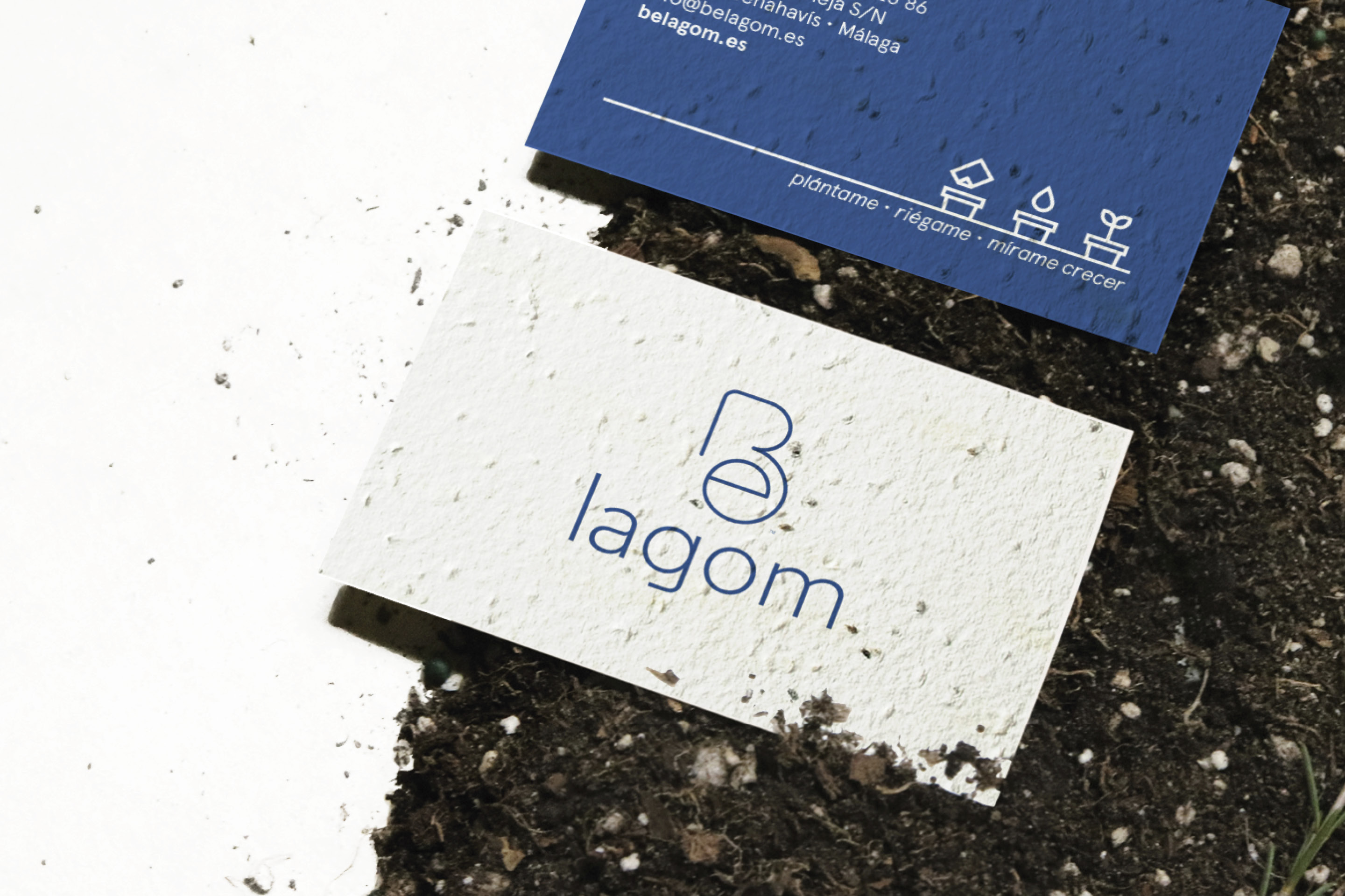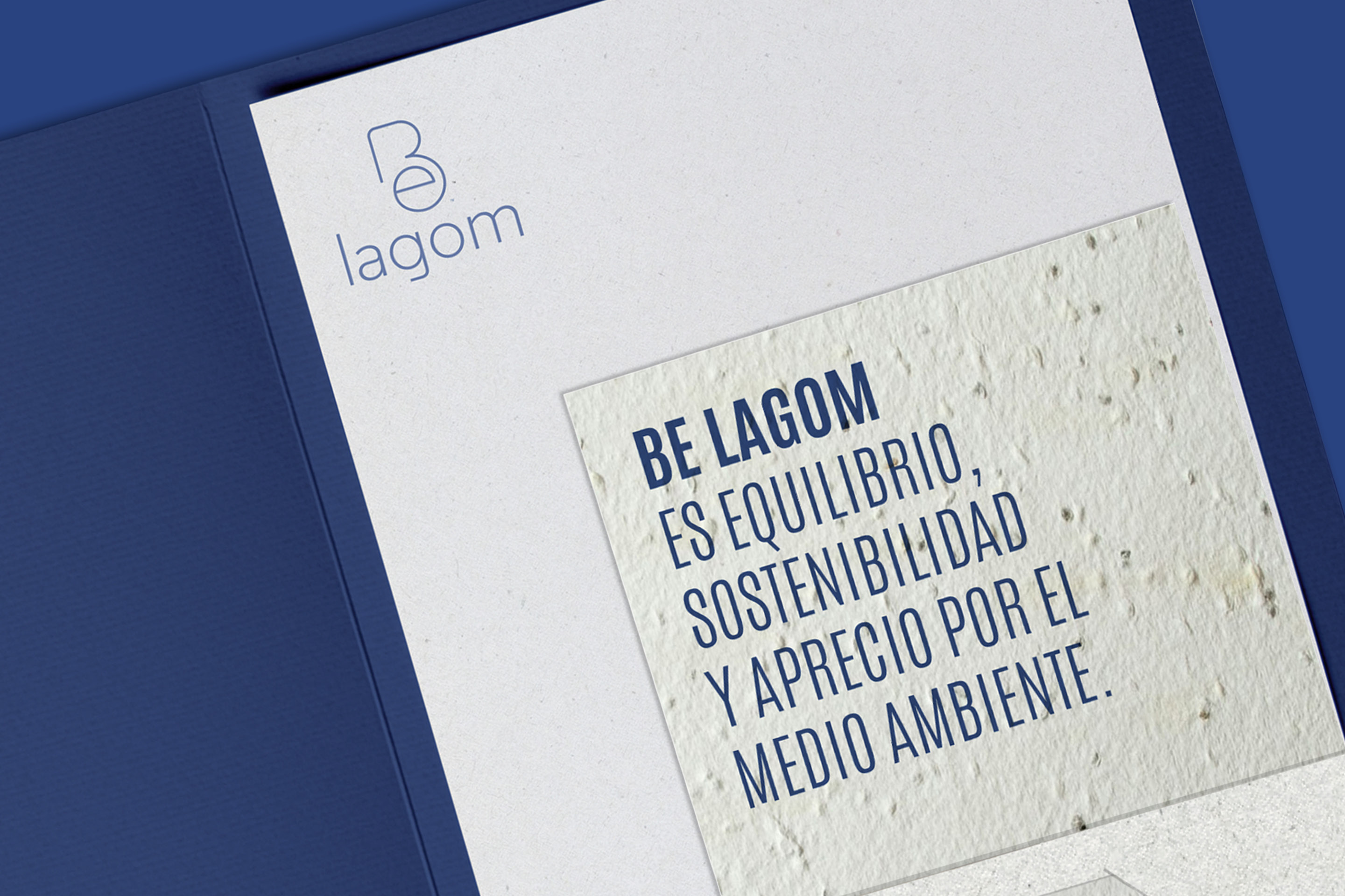 Be Lagom integra materiales ecológicos y acabados sostenibles en todas sus aplicaciones, reforzando su compromiso con la naturaleza. Cada aplicación — banderolas, publicidad, carpetas ...— y cada regalo —kits para sembrar semillas, delantales o bolsitas de saco con semillas— buscan generar una conexión directa con el entorno natural. La paleta azul, que realza los tonos de los materiales, crea una identidad visual coherente, elegante y distintiva.