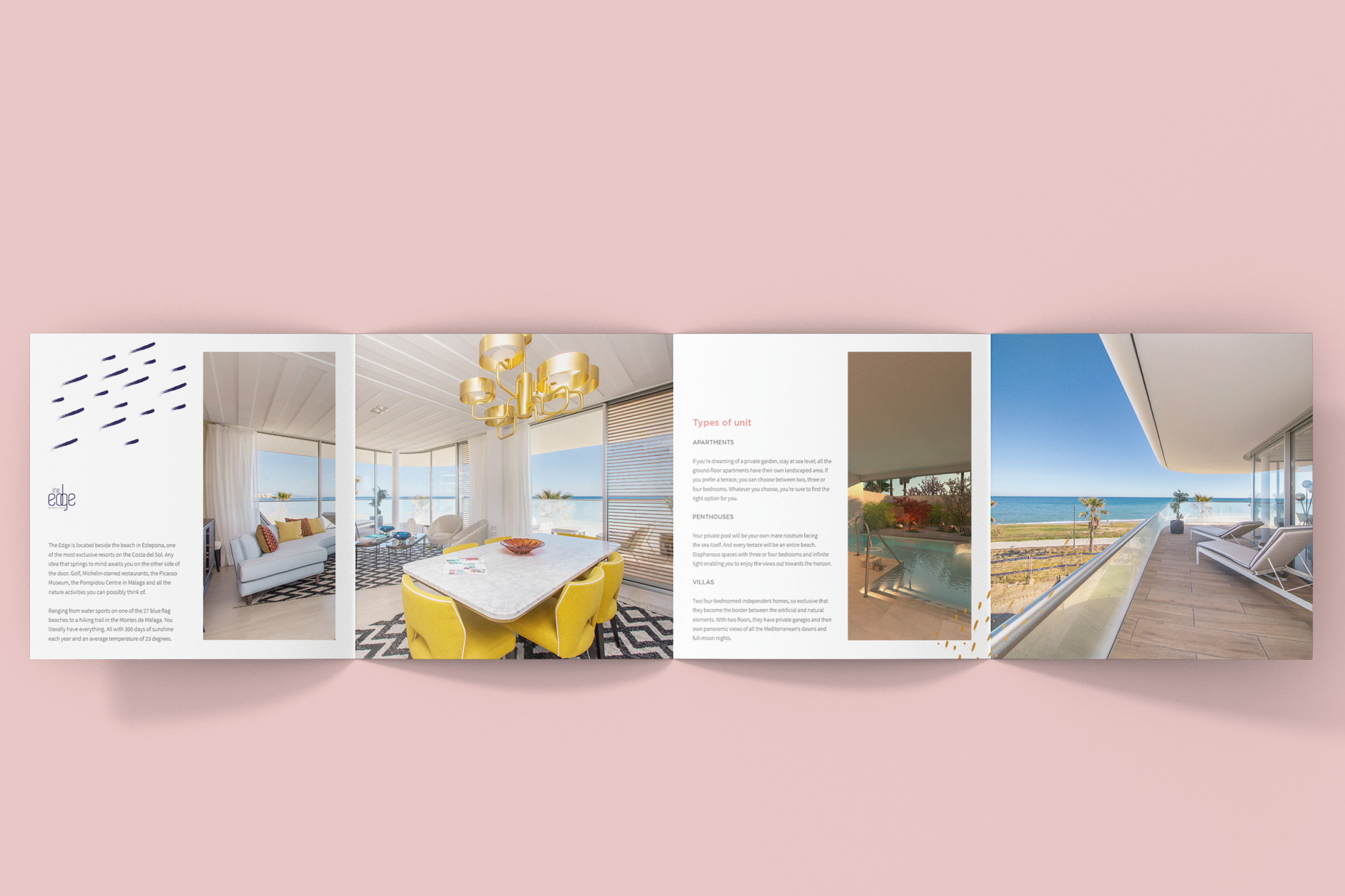 Desarrollamos el naming “ The Edge” porque significa “el límite”, haciendo referencia tanto a su ubicación en la línea de costa como a la idea de estar en el borde de lo extraordinario. Para el logotipo, realizamos una composición de las letras DG entrelazadas, que remiten a las líneas fluidas del edificio.