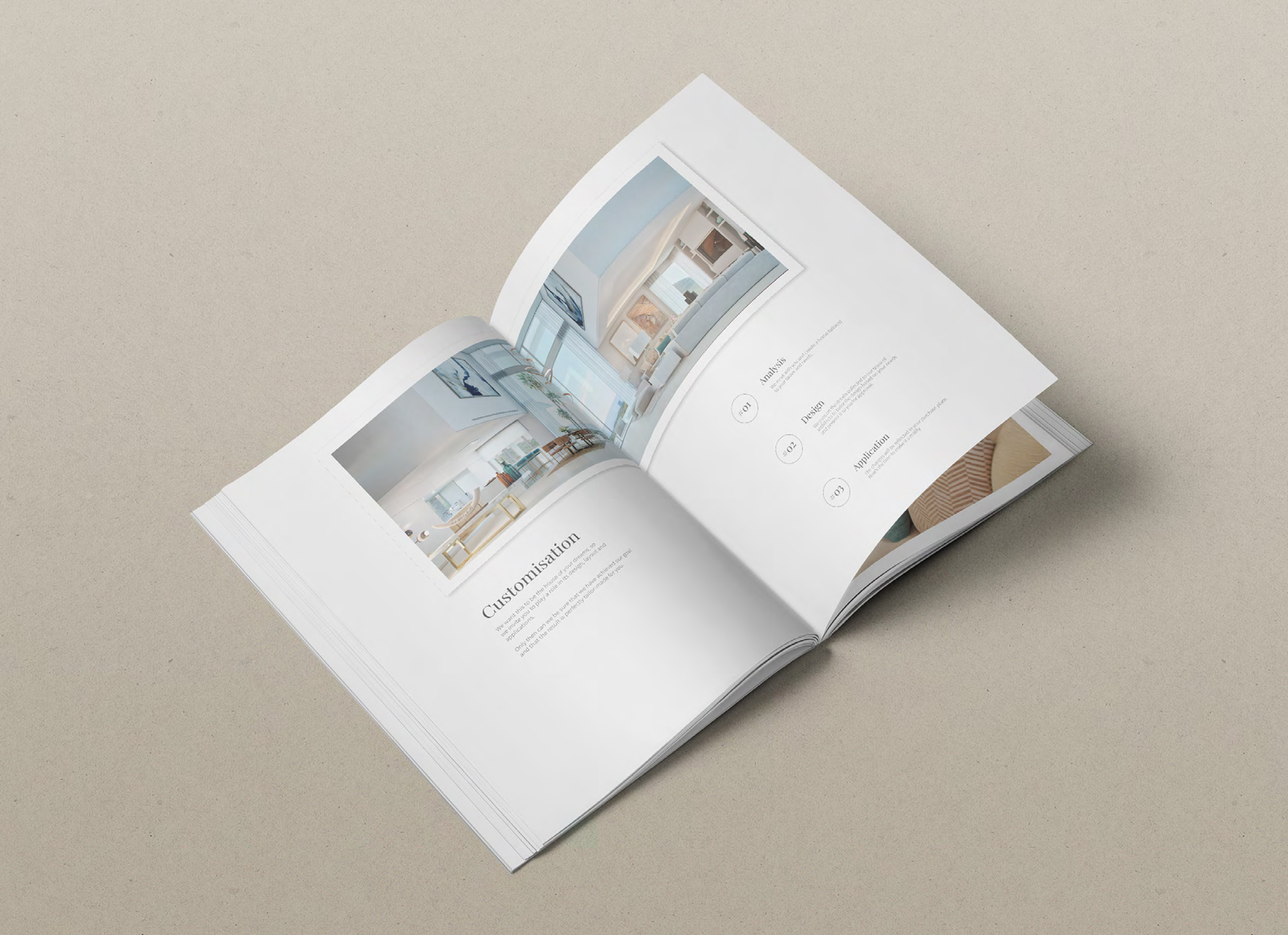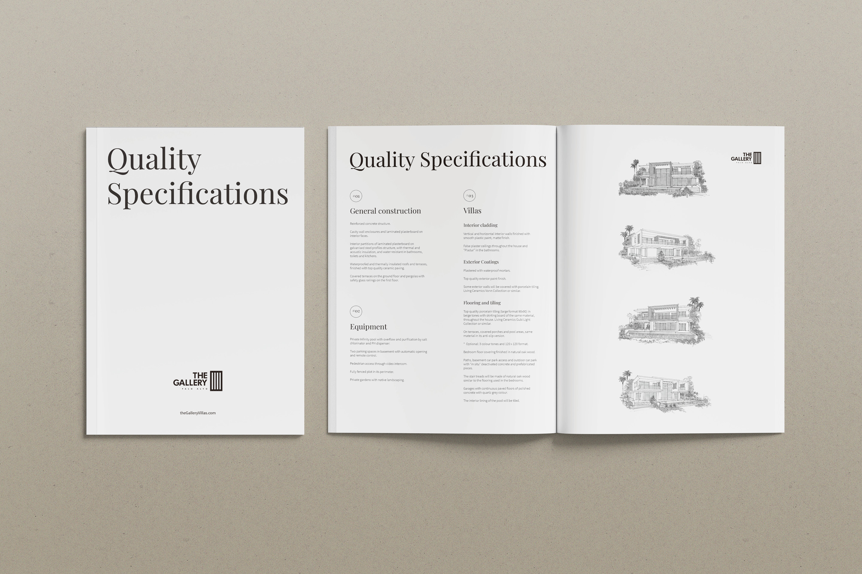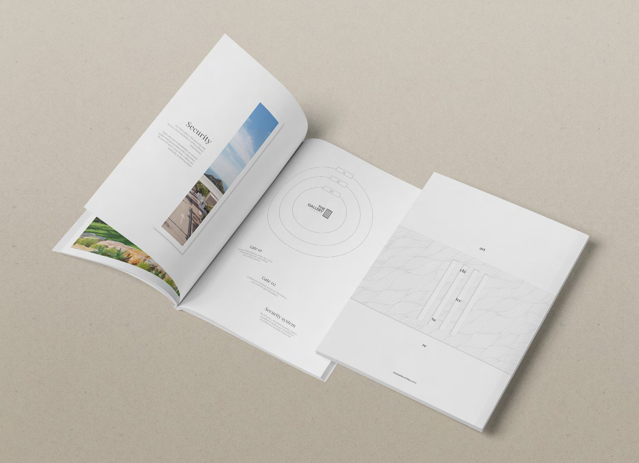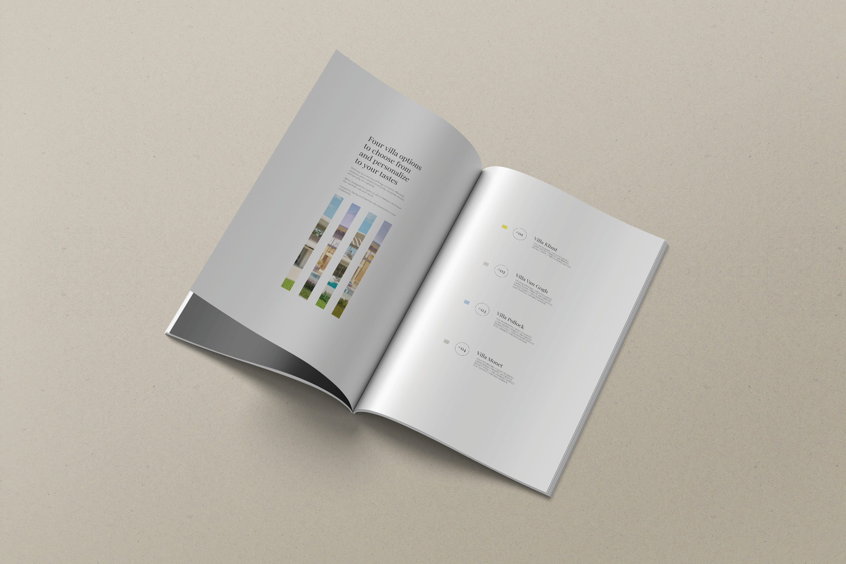 El diseño minimalista se convierte en el mejor aliado para resaltar la exclusividad del proyecto. El contraste entre blanco y negro aporta un carácter sobrio y elegante, mientras que la disposición de algunos textos en vertical añade un detalle gráfico distintivo, casi artístico, que refuerza el concepto de galería. La estructura está organizada al detalle: cada villa se presenta como una obra única, acompañada de sus planos arquitectónicos, imágenes y descripciones. Los espacios en blanco y la cuidada maquetación generan un ritmo visual que transmite calma, lujo y atención al detalle.